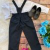 Conjunto composto por: Camisa social manga longa na cor branca, gravata borboleta e calça com suspensório na cor preta.