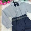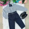 Conjunto composto por: Camisa social Manga Longa linho na Cinza, cinto na cor Preto, calça na cor Preto e Gravata borboleta Preto.