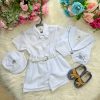 Conjunto composto por camisa social branca, shorts branco, colete branco, gravata borboleta branca, cinto e Boina
