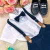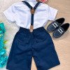 Conjunto composto por: Camisa social manga curta na cor branca, shorts com suspensório e gravata borboleta na cor azul marinho. Demais peças ou acessórios, não inclusos.