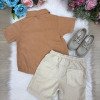Esse conjunto é a escolha perfeita para os meninos que amam se vestir com estilo e conforto, ideal para aniversários, passeios, eventos e momentos especiais ao ar livre. Camisa:Confeccionada em tecido tipo linho 100% viscose, na cor marrom, possui modelagem moderna com mangas curtas, gola clássica, bolsinho frontal e botões em tom amadeirado, que trazem um toque artesanal e sofisticado. Bermuda:Acompanha bermuda bege de linho com cós elástico e cordão de ajuste 70% poliester, 16% viscose, 11% linho, 3% algodão, garantindo conforto e praticidade. O tecido leve e de toque suave proporciona liberdade de movimento, ideal para dias mais quentes. Destaques: Tecido leve e confortável tipo linho Modelagem moderna e elegante Cós com elástico e cordão regulável Ideal para eventos casuais ou festas ao ar livre Cores neutras e combináveis com diferentes calçados Sugestão de uso: Combine com mocassim ou sandálias infantis para um look completo e encantador! Perfeito para:Batizados, casamentos diurnos, ensaios fotográficos, festas de aniversário e momentos em família.