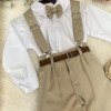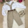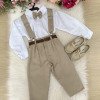 TECIDO: CAMISA BRANCA MANGA LONGA MICROFIBRA 100% POLIESTERTECIDO DA CALÇA TWILL COLORIDO 100% POLIESTER Conjunto composto por: Camisa social na cor Branca manga longa, gravata borboleta bege calça na cor bege, suspensorio begee Cinto marrom Demais peças ou acessórios, não inclusos. Calçados Vendindos Separadamente * LEMBRANDO QUE PODERA HAVER VARIAÇÃO DE TONALIDADE DO PRODUTO DEPENDENDO DA TELA DO SEU DISPOSITIVO
