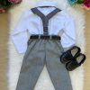 Conjunto composto por: Camisa social na cor Branca manga longa, gravata CINZA, calça na cor CINZA, suspensorio CINZA e cinto.