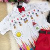 TECIDO: CAMISA MICROFIBRA 100% POLIESTER SHORTS TWILL 100 % POLIESTER     Conjunto composto por: Camisa social na cor Branca com Desenhos, Gravata Borboleta Azu,Shorts na cor Azul e Cinto na Cor Preta   FORMATURA,COLORIDOS,ABC,LAPIS,AQUARELA     Demais peças ou acessórios, não inclusos.   Calçados Vendindos Separadamente     * LEMBRANDO QUE PODERA HAVER VARIAÇÃO DE TONALIDADE DO PRODUTO DEPENDENDO DA TELA DO SEU DISPOSITIVO