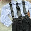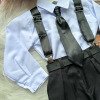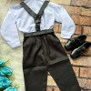 TECIDO: CAMISA BRANCA MANGA Longa MICROFIBRA 100% POLIESTER TECIDO DA CALÇA TWILL COLORIDO 100% POLIESTER SUSPENSORIO EM CETIM 100% POLIESTERNOIVINHOCASAMENTOPAJEMBATIZADO Conjunto composto por: Camisa social branca na cor, gravata, cinto e calça com suspensório na cor preta. Demais peças ou acessórios, não inclusos. * LEMBRANDO QUE PODERA HAVER VARIAÇÃO DE TONALIDADE DO PRODUTO DEPENDENDO DA TELA DO SEU DISPOSITIVO