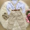 Conjunto composto por: Camisa social na cor branca, gravata borboleta, cinto, suspensório e calça na cor linho.