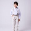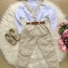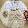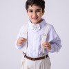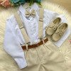 Conjunto Social Infantil Vitor – Estilo e Elegância para Momentos Especiais Este conjunto social infantil é a escolha perfeita para deixar os pequenos elegantes e confortáveis em casamentos, batizados, aniversários, formaturas e cerimônias em geral.Com um visual sofisticado e moderno, é ideal para quem busca estilo com praticidade e ótimo caimento. Detalhes do Produto: Camisa social branca de manga longa, confeccionada em microfibra 100% poliéster, com toque macio, leve e confortável; Calça linho em 70% poliester, 16% viscose, 11% linho, 3% algodão, com corte reto e caimento elegante; Gravata borboleta linho, combinando com o tom da calça; Suspensório linho com regulagem ajustável; Cinto marrom com fivela metálica, ajustável. Atenção: Calçados e demais acessórios vendidos separadamente; Produto delicado: recomendamos lavagem à mão com sabão neutro; Tonalidade pode variar de acordo com o lote; As medidas podem variar em até 2cm. Recomendamos sempre consultar a tabela de medidas antes da compra para evitar erros. As cores do produto podem sofrer variações de tonalidade conforme a configuração da tela do seu dispositivo.