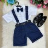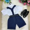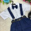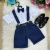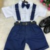 Conjunto composto por: Camisa social na cor Branca manga curta, gravata azul marinho, short na cor azul marinho, suspensorio azul marinho e cinto.