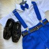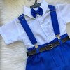 Este conjunto social infantil é a escolha perfeita para deixar os pequenos elegantes e confortáveis em eventos como casamentos, batizados, aniversários, formaturas e cerimônias em geral. Com um visual sofisticado, ele é ideal para quem busca estilo com praticidade. Detalhes do Produto: Camisa social branca de manga curta, confeccionada em microfibra 100% poliéster, com toque macio e caimento leve. Short preto em twill 100% poliéster, com acabamento moderno na barra dobrada. Acompanha gravata borboleta azul royal, suspensório azul royal com regulagem e cinto ajustável preto com fivela metálica. Itens Inclusos:CamisaShortGravata borboletaSuspensórioCinto Calçado não incluso – vendido separadamente. Disponivel em nosso site na categoria calçados meninosAs tonalidades das peças podem variar de acordo com as configurações de tela do seu dispositivo.Para garantir o ajuste ideal, consulte sempre a nossa tabela de medidas antes de finalizar a compra. As medidas podem apresentar pequenas variações conforme o lote de fabricação.