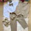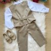 Conjunto composto por: Camisa social na cor branca manga Longa, gravata borboleta Bege, cinto, Calça na cor bege e colete na cor bege.