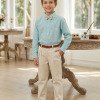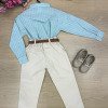 Conjunto Social Henrique – Elegância Clássica Um conjunto sofisticado e moderno, perfeito para ocasiões especiais. A combinação da camisa com a calça social cria um visual elegante, ideal para deixar os pequenos ainda mais estilosos em eventos importantes. Perfeito para casamentos, aniversários, batizados, formaturas e ensaios fotográficos. Detalhes do Conjunto • Camisa social verde de manga longa • Estampa listrada delicada, trazendo um visual clássico e sofisticado • Gola social estruturada • Fechamento frontal por botões • Punhos com botões, permitindo melhor ajuste nas mangas • Tecido leve e confortável • Calça social bege • Modelagem elegante com pregas frontais • Corte moderno que garante bom caimento • Cintura com passantes para uso de cinto • Cinto marrom • Acessório clássico que complementa o visual • Gravata borboleta bege •Detalhe sofisticado que completa o look social Destaques do Look • Visual clássico e elegante • Combinação de cores sofisticadas e versáteis • Ideal para eventos especiais e fotos marcantes Informações Importantes • Calçados não acompanha o produto • Tecido camisa 100% algodão/ calça oxford 100% poliester • Acessórios das fotos são ilustrativos • As cores podem variar conforme a tela do dispositivo • As medidas podem variar em até 2cm