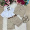 Conjunto composto por: Camisa social na cor Branca, gravata borboleta BEGE shorts na cor BEGE, Colete BEGE e Cinto MORRON