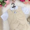 Conjunto Social Infantil Leandro Um look clássico, elegante e extremamente charmoso, ideal para casamentos, batizados, aniversários e eventos especiais. Tecidos Camisa: Microfibra 100% poliéster – leve, confortável e com toque macio. Colete e bermuda: Sarja 100% poliéster – estruturada, resistente e com excelente caimento. O conjunto é composto por: Camisa social branca de manga curta Gravata borboleta bege Colete bege com fechamento frontal por botões Bermuda bege com barra dobrada A composição em tons neutros traz sofisticação e versatilidade, permitindo combinações elegantes para diferentes ocasiões. O colete adiciona um ar formal e refinado, enquanto a bermuda mantém o visual moderno e apropriado para dias mais quentes. Informações Importantes Demais peças e acessórios da foto não estão inclusos. Calçados vendidos separadamente. Pode haver variação de tonalidade conforme a configuração da tela do seu dispositivo.