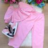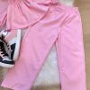 Design: O conjunto inclui uma blusinha de manga curta com detalhes delicados e uma calça combinando, tudo na cor rosa bebê que traz um toque suave e adorável.