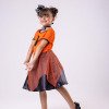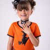 Fantasia Temática Halloween – Bruxinha Laranja com Tule Encante a criançada neste Halloween com essa fantasia super estilosa e divertida!O modelo traz a magia da data com estampa de bruxinha voando na parte superior e saia de tule laranja com brilho, sobreposta a tecido preto que dá um charme extra. O acabamento com gola preta e mangas curtinhas deixa o look ainda mais gracioso e confortável. Destaques do modelo: Fantasia temática Halloween Estampa de bruxinha Saia com tule laranja brilhante sobre tecido preto Gola e mangas com acabamento preto Confortável e cheia de movimento Ideal para festas, eventos escolares, truques ou travessuras e sessões de fotos inesquecíveis! Informações Importantes As medidas podem variar em até 2cm. Recomendamos sempre consultar a tabela de medidas antes da compra para evitar erros. Cuidado ao vestir: não forçar a entrada ou puxar o tecido, pois pode esgarçar a costura ➝ Não realizaremos troca por mau uso. Tiara e outros acessórios não acompanham o produto, mas estão disponíveis em nosso site. Calçado vendido separadamente, disponível na categoria Calçados. As cores do produto podem sofrer variações de tonalidade conforme a configuração da tela do seu dispositivo.