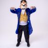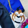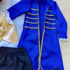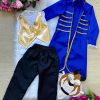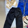 Linda camisa branca com detalhe em renda, camisa manga longa azul royal, colete dourado e calça preta