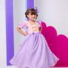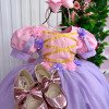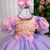 Vestido/Fantasia Infantil Rapunzel Luxo Um verdadeiro conto de fadas transformado em vestido! Inspirado na doce e sonhadora Princesa Rapunzel, este modelo é perfeito para meninas que amam brilho, cor e encanto. Com saia ampla e armada em camadas de tule lilás cintilante, o vestido cria um efeito leve e mágico a cada movimento. O corpete rosa possui fitas douradas cruzadas e flores de cetim aplicadas nas mangas bufantes e na cintura, trazendo o romantismo e a delicadeza que marcam a princesa dos cabelos dourados. O visual é finalizado com um laço de cabelo rosa com detalhe perolado, combinando perfeitamente com o vestido e garantindo um toque de charme e sofisticação. Destaques: Modelo inspirado na Princesa Rapunzel Flores de cetim rosa e lilás com acabamento artesanal Fitas douradas cruzadas no corpete Tule lilás com brilho suave e caimento leve Ideal para festas, ensaios fotográficos e aniversários temáticos Informações Importantes As medidas podem variar em até 2cm. Recomendamos sempre consultar a tabela de medidas antes da compra para evitar erros. Tecido Tecnosport 100% poliester Para um volume extra, indicamos o uso de saiote de armação, vendido separadamente na categoria Acessórios. Tiara e outros acessórios não acompanham o produto, mas estão disponíveis em nosso site. Calçado vendido separadamente, disponível na categoria Calçados As cores do produto podem sofrer variações de tonalidade conforme a configuração da tela do seu dispositivo.