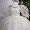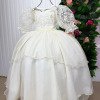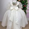 Elegância e encanto em cada detalhe!Este vestido longo foi criado para brilhar em momentos especiais. O busto apresenta bordados florais com fios de brilho, que combinam perfeitamente com o tule transparente superior, formando um decote suave e delicado. As mangas bufantes em tule bordado dão um toque romântico e sofisticado. Na cintura, o modelo vem com cinto de pérolas que realça a silhueta e adiciona um charme clássico. A saia tem camadas de tule com leve brilho, criando movimento e um caimento leve e encantador. Na parte de trás, o destaque vai para o lindo laço volumoso em tecido acetinado e o lastex central, que garante conforto e ótimo ajuste ao corpo. Principais detalhes: Cor: Off-white  Tecido: Tule com brilho, forro leve e bordado floral Manga: Bufante em tule bordado Cintura: cinto de pérolas  Saia: Três camadas fluidas de tule com brilho Costas: Lastex central e laço grande  Comprimento: Longo    Perfeito para: daminhas, batizados, aniversários, ensaios fotográficos e eventos especiais. Informações Importantes  As medidas podem variar em até 2cm. Recomendamos sempre consultar a tabela de medidas antes da compra para evitar erros. Tecido Tecnosport 100% poliester Para um volume extra, indicamos o uso de saiote de armação, vendido separadamente na categoria Acessórios. Tiara e outros acessórios não acompanham o produto, mas estão disponíveis em nosso site. Calçado vendido separadamente, disponível na categoria Calçados As cores do produto podem sofrer variações de tonalidade conforme a configuração da tela do seu dispositivo.