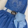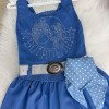 Vestido Infantil Boiadeira do Sertão Apresentamos o Vestido Infantil Boiadeira, uma peça encantadora que une o estilo country à delicadeza infantil, criando um visual moderno, confortável e cheio de personalidade.Ocasiões Indicadas: perfeito para festas country, aniversários temáticos, festas juninas, eventos escolares, ensaios fotográficos e passeios especiais.Detalhes do Vestido Confeccionado em tecido leve e confortável, o Vestido Infantil Boiadeira oferece excelente caimento e liberdade de movimento. • Parte superior com aplicação em strass, formando desenho e escrita temática• Modelagem sem mangas, proporcionando frescor• Cintura marcada com cinto decorativo• Lenço lateral estampado, agregando charme ao visual• Saia com caimento leve e delicado• O cinto e o lenço acompanham o vestido. • Composição: Tecido 100% poliésterInformações Importantes • As medidas podem variar em até 2 cm. Recomendamos sempre consultar a tabela de medidas antes da compra. • Chapéu, botas e demais acessórios não acompanham o produto, sendo vendidos separadamente. • As cores do produto podem sofrer variações de tonalidade conforme a tela do dispositivo.