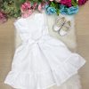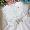 Um modelo clássico e encantador, feito para brilhar em momentos especiais.O vestido infantil valeria combina elegância e delicadeza em cada detalhe — ideal para festas, casamentos, batizados, aniversários e celebrações em família. Descrição detalhada: Modelagem: Vestido evasê com babado na barra, proporcionando movimento e volume na medida certa. Tecido: Techno ligth 100% poliester de alta qualidade, com leve brilho e toque macio, garantindo conforto e caimento perfeito. Detalhes: Aplicações de renda branca trabalhada, criando um visual romântico e delicado. Laço de pérolas no centro da cintura, com acabamento dourado e brilho elegante Fechamento com lastex, que se ajusta ao corpo da criança, oferecendo conforto e mobilidade. Laço para amarrar na cintura, ajustável e decorativo. Acabamento: Costuras reforçadas e acabamento premium, ideal para uso prolongado e eventos formais. Evitar puxar o lastex ou o tecido com força ao vestir. Um vestido que une charme, qualidade e conforto — perfeito para transformar qualquer momento em um registro inesquecível! Informações Importantes As medidas podem variar em até 2cm. Recomendamos sempre consultar a tabela de medidas antes da compra para evitar erros. Para um volume extra, indicamos o uso de saiote de armação, vendido separadamente na categoria Acessórios. Tiara e outros acessórios não acompanham o produto, mas estão disponíveis em nosso site. Calçado vendido separadamente, disponível na categoria Calçados As cores do produto podem sofrer variações de tonalidade conforme a configuração da tela do seu dispositivo.