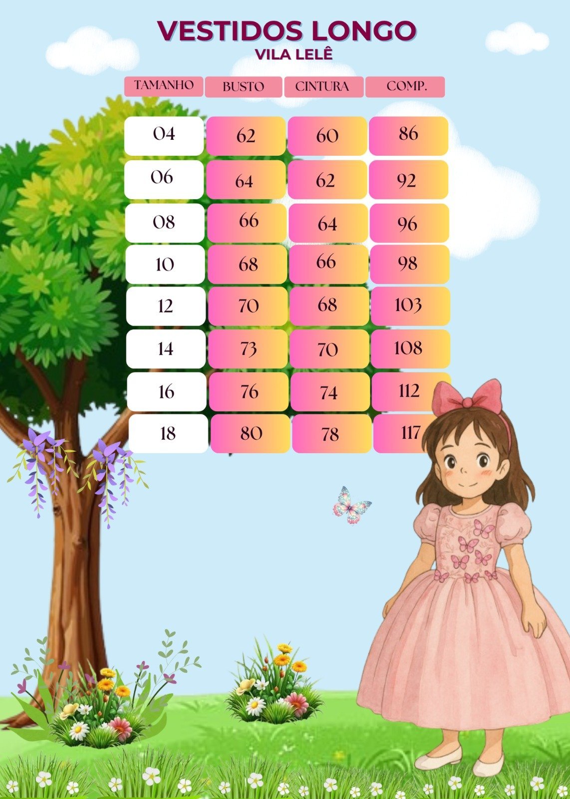 | Tamanho | 4, 6, 8, 10, 12, 14, 16 |