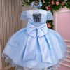 Confeccionado em tecido misto possui forro em poliéster e algodão para não incomodar a criança e proporcionando um caimento incrível e sofisticado, possui gola redonda, comprimento médio, mangas curtas, possui elástico nas costas para melhor ajuste, acabamento com lindo laço na parte posterior do vestido completa o look dos sonhos!