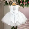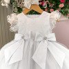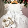 Tecido Tafeta: interno 100% poliester/ externo 100% poliester/ tule 100% poliester  Confeccionado em tecido misto possui forro em poliéster e algodão para não incomodar a criança e proporcionando um caimento incrível e sofisticado, possui gola redonda, comprimento médio, mangas curtas, possui elástico nas costas para melhor ajuste, acabamento com lindo laço na parte posterior do vestido completa o look dos sonhos!   * Medidas podem variar em até 2cm * Caso queira o vestido mais armado, recomendamos o uso do saiote ou anágua de armação, disponível no nosso site na categoria acessórios. * Tiara vendida separadamente, disponível em nosso site na categoria acessórios. * Calçados vendido separadamente, disponível em nosso site na categoria calçados. * LEMBRANDO QUE PODERA HAVER VARIAÇÃO DE TONALIDADE DO PRODUTO DEPENDENDO DA TELA DO SEU DISPOSITIVO