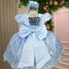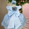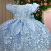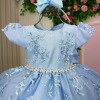 Confeccionado em tecido misto possui forro em poliéster e algodão para não incomodar a criança e proporcionando um caimento incrível e sofisticado, possui gola redonda, comprimento médio, mangas curtas, contém, também, elástico nas costas para melhor ajuste, acabamento com lindo laço na parte posterior do vestido completa o look dos sonhos!