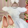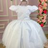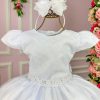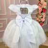 Confeccionado em tecido misto possui forro em poliéster e algodão para não incomodar a criança e proporcionando um caimento incrível e sofisticado, possui gola redonda, comprimento médio, mangas curtas, perolás,laços, possui elástico nas costas para melhor ajuste.