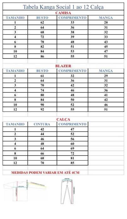 | Tamanho | 4, 6, 8, 10, 12, 14 |