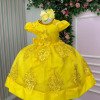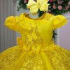 Inspirado na delicadeza das princesas, o modelo vem em um tom amarelo dourado radiante, com bordados florais em relevo, apliques 3D com pérolas e lindo laço nas costas — um charme em cada detalhe!    Perfeito para ocasiões especiais como aniversários, casamentos, batizados e sessões de fotos temáticas, ele traz aquele toque de elegância e magia que transforma qualquer momento em um conto de fadas. Um verdadeiro encanto em forma de vestido! Este modelo foi criado para brilhar em momentos inesquecíveis. Informações Importantes As medidas podem variar em até 2cm. Recomendamos sempre consultar a tabela de medidas antes da compra para evitar erros. Tecido 100% poliester Para um volume extra, indicamos o uso de saiote de armação, vendido separadamente na categoria Acessórios. Tiara e outros acessórios não acompanham o produto, mas estão disponíveis em nosso site. Calçado vendido separadamente, disponível na categoria Calçados As cores do produto podem sofrer variações de tonalidade conforme a configuração da tela do seu dispositivo.