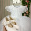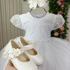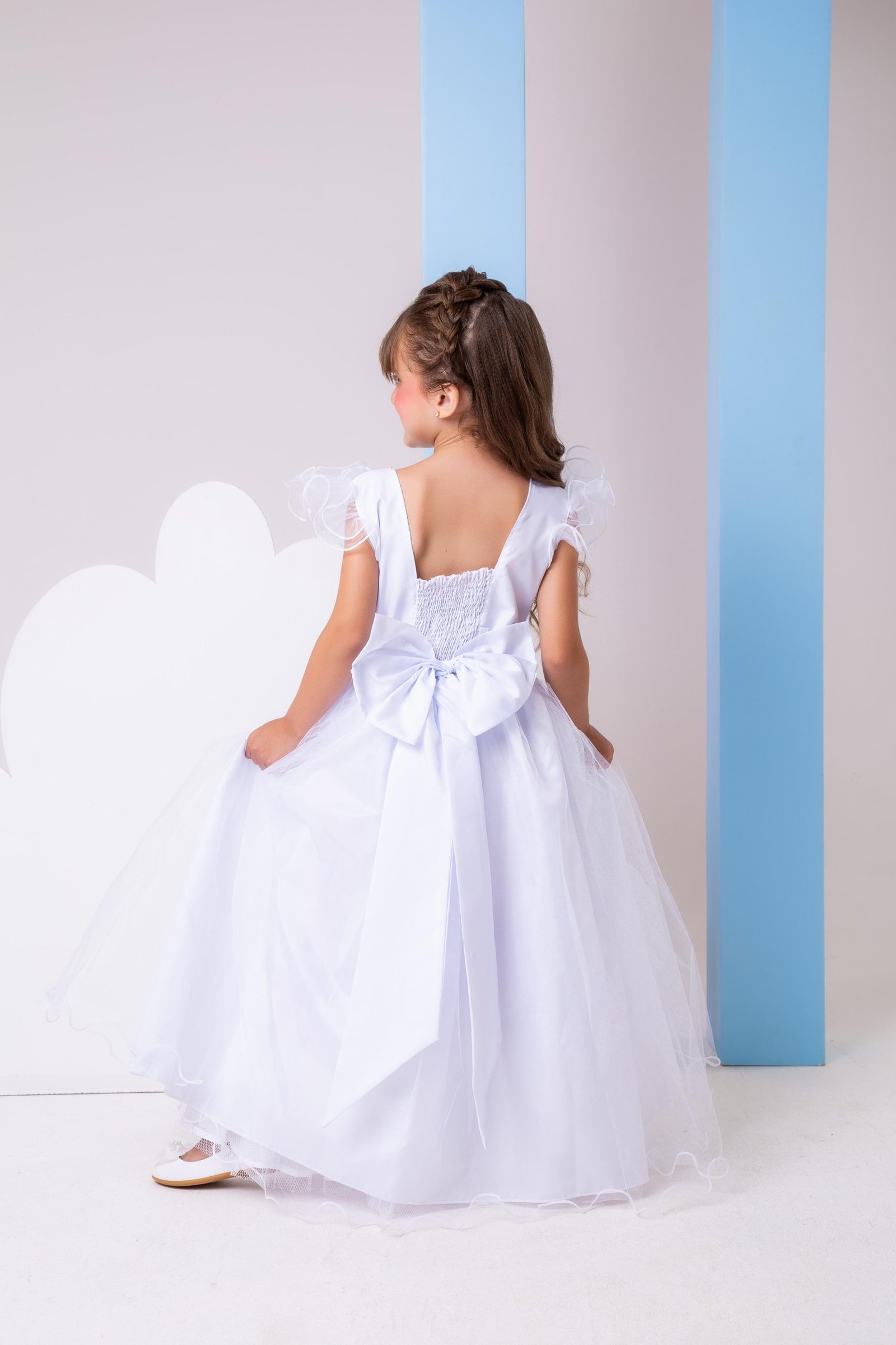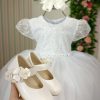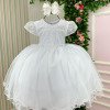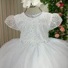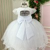 Confeccionado em tecido misto possui forro em poliéster e algodão para não incomodar a criança e proporcionando um caimento incrível e sofisticado, possui gola redonda, comprimento médio, mangas curtas, apliques de laço e perolás, contém, também, elástico nas costas para melhor ajuste, acabamento com lindo laço na parte posterior do vestido completa o look dos sonhos!