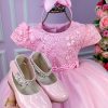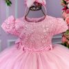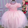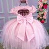 Confeccionado em tecido misto possui forro em poliéster e algodão para não incomodar a criança e proporcionando um caimento incrível e sofisticado, possui gola redonda, comprimento médio, mangas curtas de tule, possui elástico nas costas para melhor ajuste, acabamento com lindo laço na parte posterior do vestido completa o look dos sonhos!