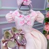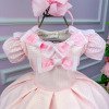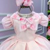 TECIDO 100% POLIESTERConfeccionado em tecido misto possui forro em poliéster e algodão para não incomodar a criança e proporcionando um caimento incrível e sofisticado, possui gola redonda, comprimento médio, mangas curtas, possui elástico nas costas para melhor ajuste, e acabamento com lindo laço na parte posterior do vestido completa o look dos sonhos!Laço,laco,laçinho,laçinnhos * Medidas podem variar em até 4cm * Caso queira o vestido mais armado, recomendamos o uso do saiote ou anágua de armação, disponível no nosso site na categoria acessórios. * Tiara vendida separadamente, disponível em nosso site na categoria acessórios. * Calçados vendido separadamente, disponível em nosso site na categoria calçados. * LEMBRANDO QUE PODERA HAVER VARIAÇÃO DE TONALIDADE DO PRODUTO DEPENDENDO DA TELA DO SEU DISPOSITIVO