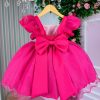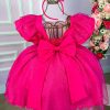 Confeccionado em tecido misto possui forro em poliéster e algodão para não incomodar a criança e proporcionando um caimento incrível e sofisticado, possui gola redonda, comprimento médio, mangas curtas de tule, possui elástico nas costas para melhor ajuste, acabamento com lindo laço na parte posterior do vestido completa o look dos sonhos!