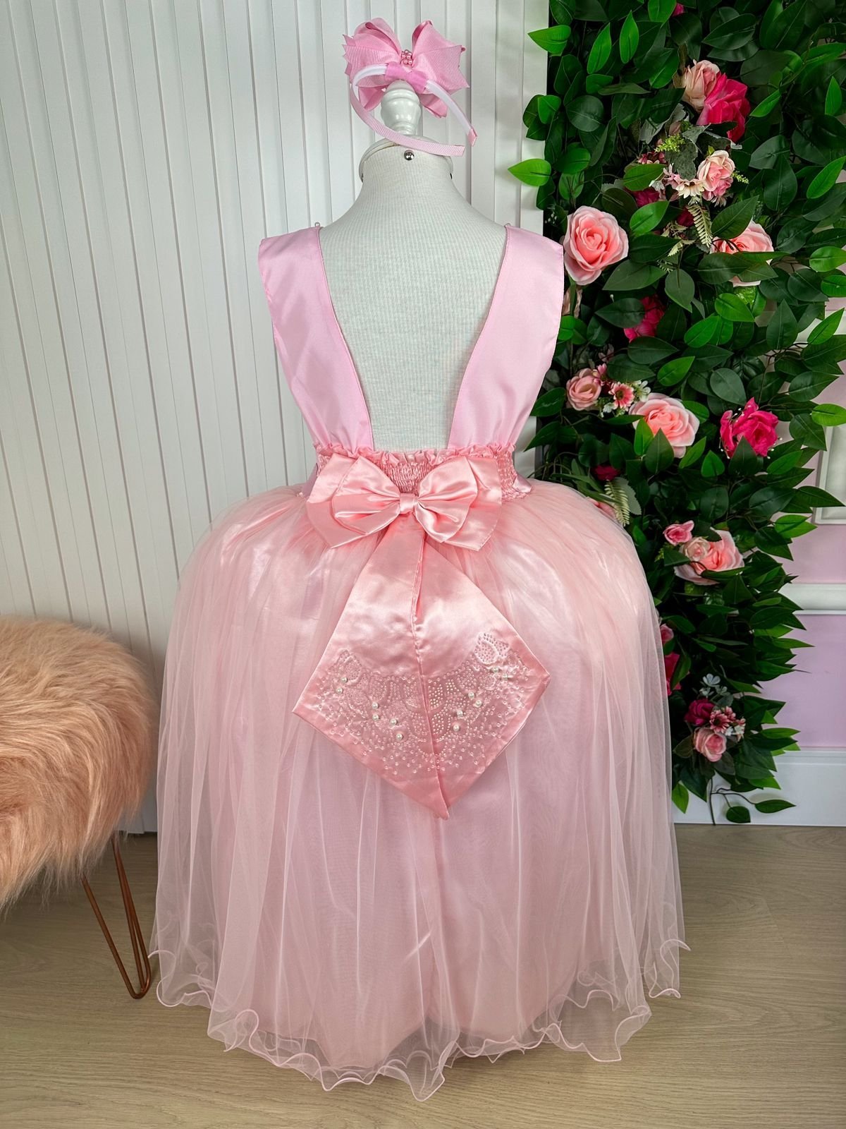 Confeccionado em tecido misto possui forro em poliéster e algodão para não incomodar a criança e proporcionando um caimento incrível e sofisticado, possui gola redonda, comprimento médio, mangas curtas, contém, também, elástico nas costas para melhor ajuste, acabamento com lindo laço na parte posterior do vestido completa o look dos sonhos!