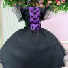 O vestido é confeccionado em tecido preto com detalhes em tule com glitter, que garantem brilho delicado e sofisticado. O busto traz acabamento com fita lilás em estilo corset, enquanto as mangas curtas bufantes em tule transparente adicionam volume e leveza. A saia midi em camadas de tule oferece movimento gracioso, perfeito para dar aquele ar encantado ao visual.