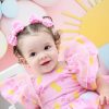 Confeccionado em tecido misto possui forro em poliéster e algodão para não incomodar a criança e proporcionando um caimento incrível e sofisticado, possui gola redonda, comprimento médio, mangas curtas, possui elástico nas costas para melhor ajuste, acabamento com lindo laço na parte posterior do vestido completa o look dos sonhos!
