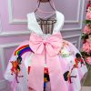 Confeccionado em tecido misto possui forro em poliéster e algodão para não incomodar a criança e proporcionando um caimento incrível e sofisticado, possui gola redonda, comprimento médio, mangas curtas, apliques de laço e perolás, contém, também, elástico nas costas para melhor ajuste.