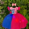 Um modelo encantador que une fofura e diversão! O vestido traz estampa exclusiva do Stitch e da Angel no busto, com fundo delicado de corações. As mangas em camadas dão um charme extra e a saia rodada dupla combina tons de azul e rosa com glitter, deixando o visual ainda mais mágico.